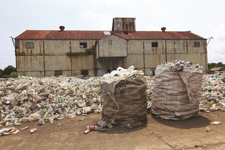 empty a large bag of plastic bottles into a compacting machine, we hear the